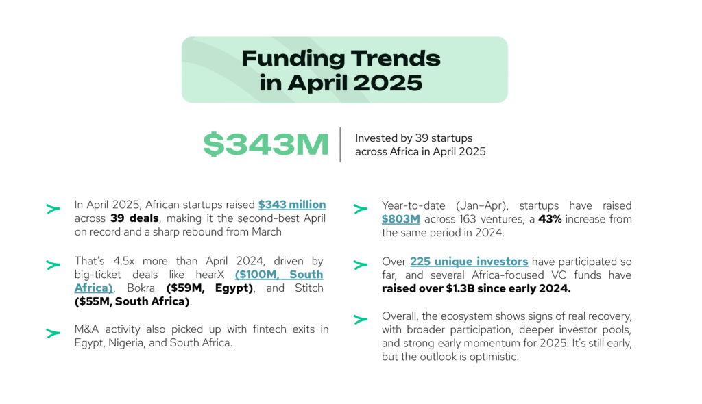 That’s 4.5x more than April 2024, driven by big-ticket deals like hearX ($100M, South Africa), Bokra ($59M, Egypt), and Stitch ($55M, South Africa).