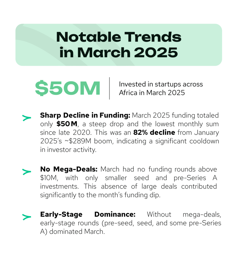 No Mega-Deals: March had no funding rounds above $10M, with only smaller seed and pre-Series A investments. This absence of large deals contributed significantly to the month’s funding dip.